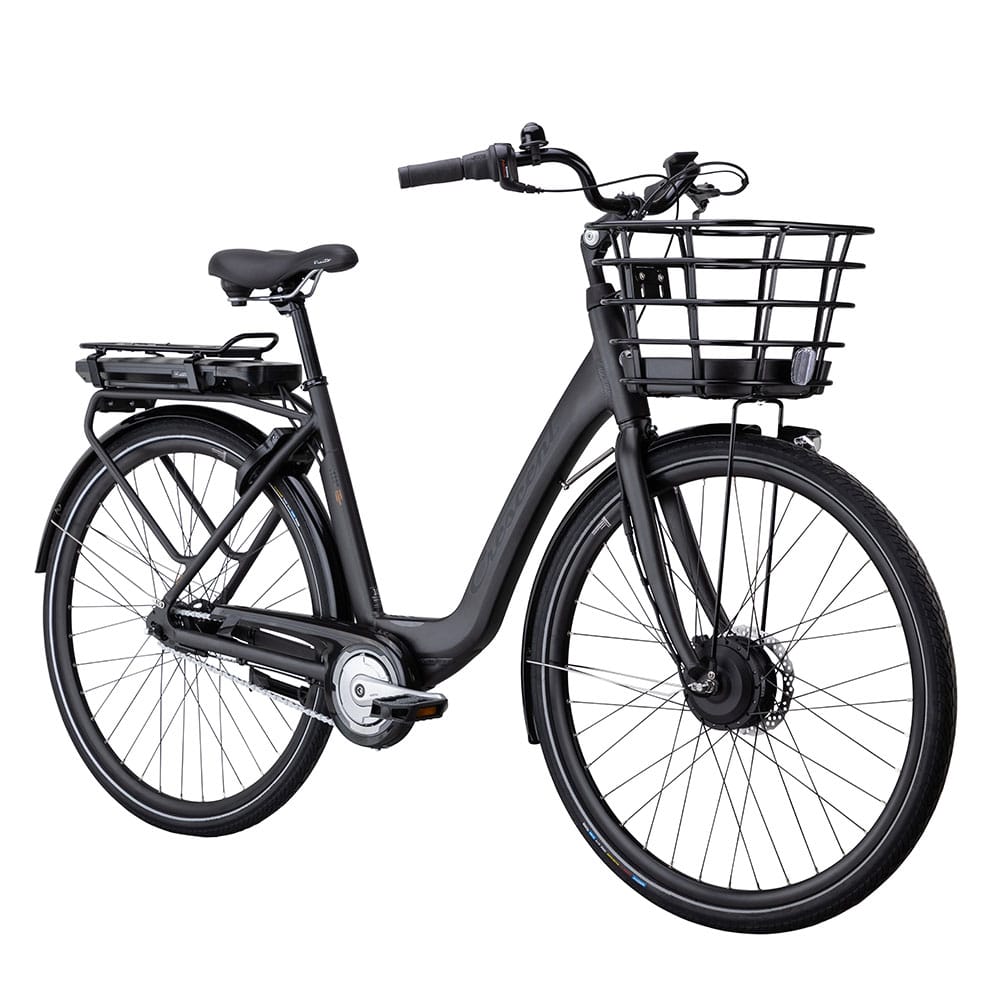 Denna cykel har ett pakethållarbatteri på 400 wh som du kan plocka ur cykeln och ta med dig. Din återförsäljare kan hjälpa dig att låsa batteriet så att det bara fungerar med din cykel och ställa in cykelns körstil så att den driver på ett sätt som passar din cykling. Allt är snyggt inbyggt i en 7-växlad damcykel av modernt snitt, med lågt insteg, fotbroms bak och skivbroms fram. Displayen på styret håller dig uppdaterad när du och cykelns batteri sitter i pakethållaren, som dessutom har en smart funktion där du enkelt klickar av och på en väska eller korg. Cykelkorg med anpassad tygväska framtill ingår, liksom stöd, godkänt ramlås och belysning.