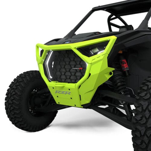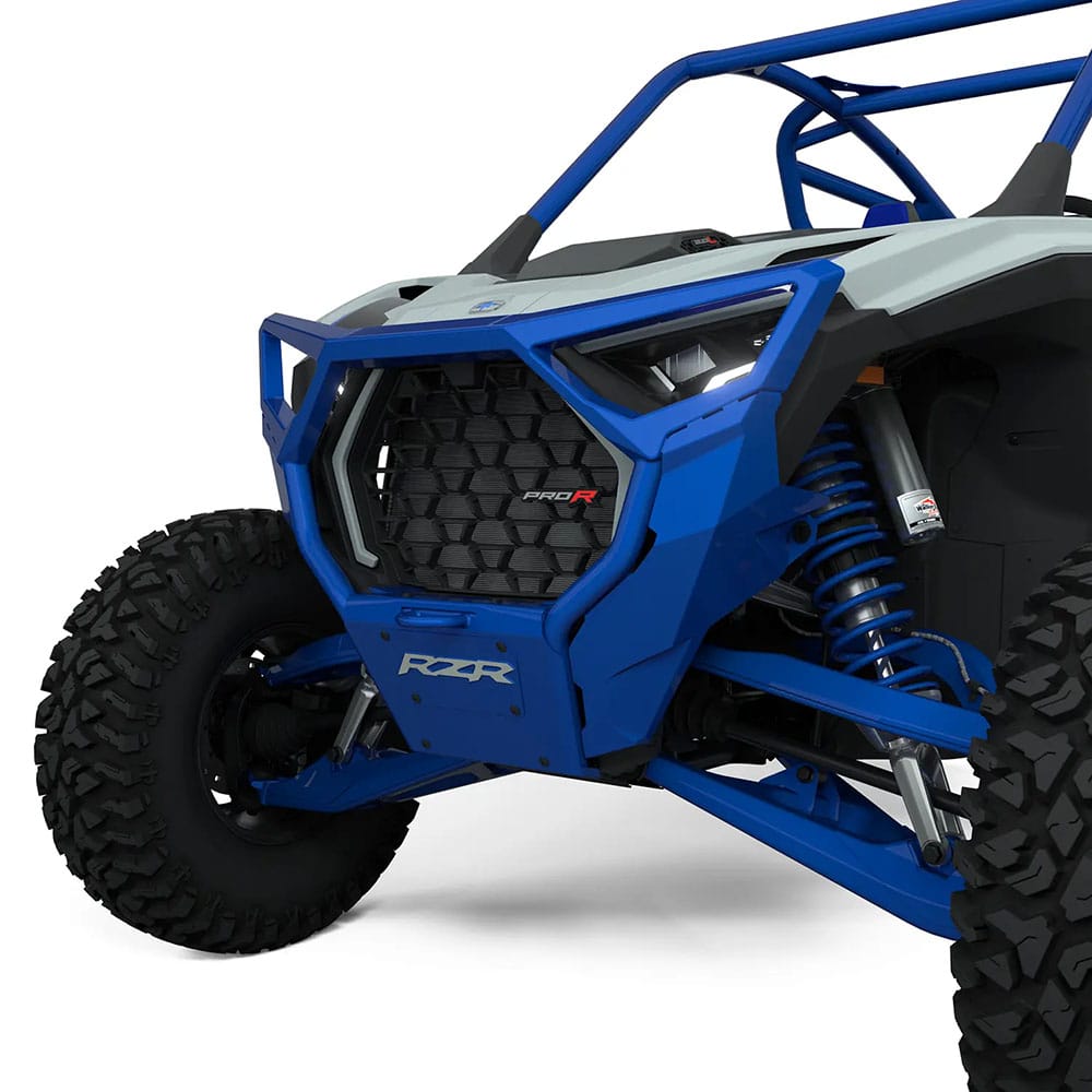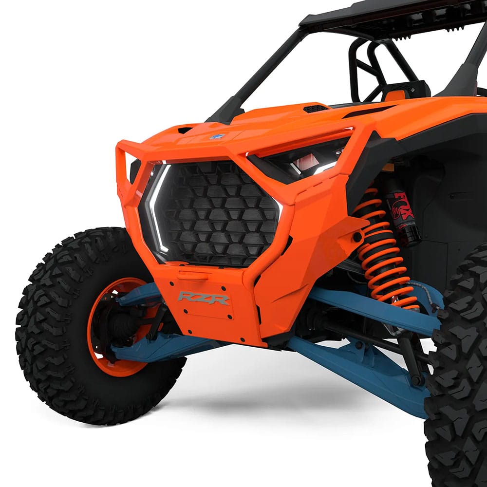 Upgrade your RZR with the Front High Coverage Bumper—a rugged and stylish addition that offers both utility and protection. This high coverage front bumper is designed to safeguard valuable components of your vehicle during off-road adventures, minimizing the risk of damage. Constructed with heavy-duty materials, it can withstand impact from obstacles like stumps and rocks. The tubular structure design and cast headlight bezels provide maximum coverage, while a built-in heavy-duty tow point ensures versatility on the trails. The bumper features a silk-screened RZR logo on the front cover plate to complement the aesthetics of your SxS. Designed for easy installation, this RZR front bumper utilizes direct-from-the-factory mounting points. All necessary mounting hardware is included. Choose from color-matched paint options to enhance the style of your RZR. Front plate is removed when bumper is used with a winch.