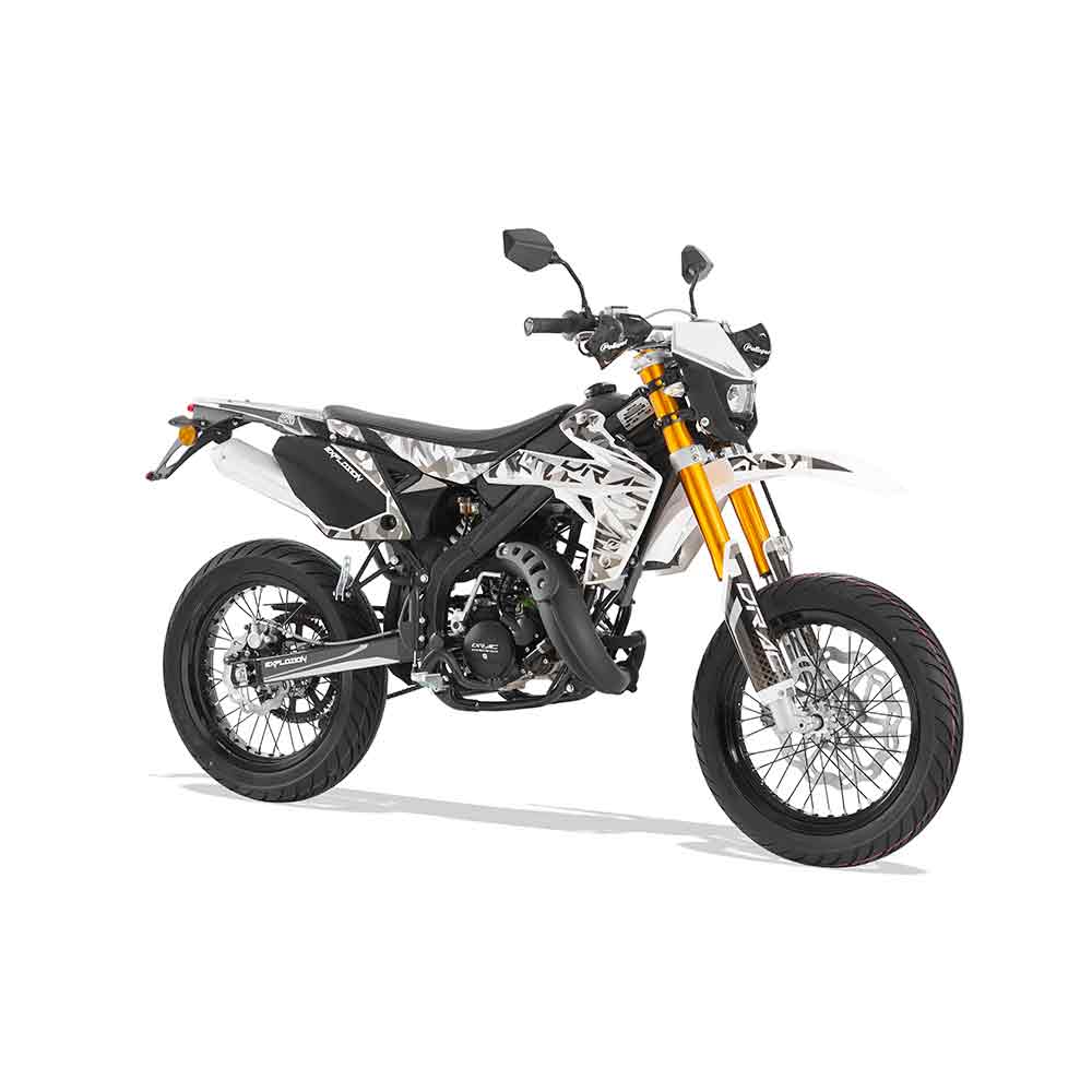 Den aggressiva färg och dekalsättningen fullbordar Pro familjen. Detta är en DRAC för den aktiva föraren som är på jakt efter ett fullbordat fordon. Framtagen endast för den Svenska och Finska marknaden, här får du ett fordon som sticker ut över det vanliga. Design i toppnivå som gör kompisarna helt ”stumma” och mycket avundsjuka. Upsidedown gaffeln förstärker PRO andan. Fjädring bak av PRO-link variant med separat gasfjäder som förbättrar köregenskaperna ytterligare. Hjul från MORAD. Digital hastighetsmätare från KOSO. Svartlackat avgasssystem med ljuddämpare i aluminium från TECHNIGAS Bromsar från J.JUAN 300 mm waveskiva fram från GALFER Platskåpor och handtagsskydd från POLISPORT Förgasare från DELORTO Miniblinkers EU45 EURO 4